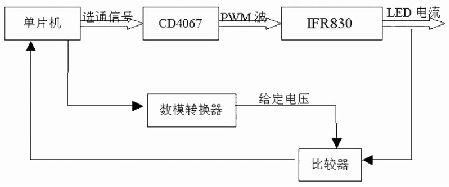 脈沖寬度調(diào)制(PWM)方式:通過人眼不易察覺的頻率快速開關LED,給人一種LED 總是亮的假象。開關時間比率決定了流過LED 的平均電流,從而決定了其亮度。脈寬調(diào)制方式和調(diào)節(jié)工作電流方式的主要區(qū)別是,沒有采用RC 積分電路,采用IFR830 代替2SK1028,通過快速控制IFR830 的通斷,使得LED 電流是一個幅值恒定, 頻率很快的脈沖電流, 這樣LED 的平均電流決定了LED 的亮度,控制流程如圖3 所示。