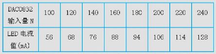 可以看出,隨著DAC0832 輸入的增大,PWM 的占空比越來越大, 對應的LED 電流值也在不斷增大。為了得到它們之間關系, 通過不斷改變程序的方法, 來測試多個DAC0832 的輸入和關鍵點電壓值(考慮到0~100之間為非線性區(qū), 所以從100 開始取值) ,測得的數(shù)據(jù)如表1 所示。