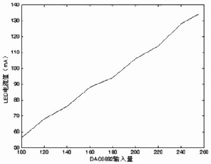 由于CD4067 芯片可以帶動十六個支路,做實驗的時候取代表性的三個支路進行控制, 通過設置三個支路的電流值, 使這三個支路達到各自的亮度。但是由于不知道LED 電流值也DAC0832 輸入值之間的關系,所以進行實驗得到它們之間的關系, 然后就可以對通信接口進行編程, 使得計算機界面的輸入值能夠和LED 電流對應上。