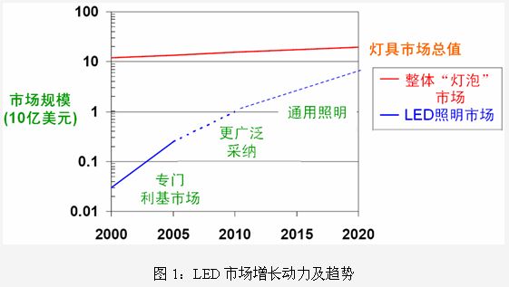 高亮度LED的光輸出、能效及成本正在迅速改善,使其應(yīng)用范圍不斷擴大。根據(jù)LED的工作電壓可以劃分為三個功率等級:0.9V至7V(手機和移動設(shè)備)、7V至60V(汽車和LCD背光)和60V至700V(通用照明)。這當(dāng)中市場成長潛力最大的是汽車、LCD背光和通用照明。汽車應(yīng)用主要包括氖燈替代、應(yīng)急車輛燈、組合尾燈、儀表盤照明、信息娛樂、內(nèi)部照明、中央高位剎車燈、前照燈、停車燈等;LCD背光主要包括大屏幕液晶電視、中等屏幕的筆記本、GPS、相框、上網(wǎng)本等;通用照明主要有離線LED驅(qū)動器/鎮(zhèn)流器、街道/區(qū)域照明、替代燈泡、替代熒光燈、交通信號燈、工作照明、景觀照明、建筑物照明等。不難看出,今后LED照明將逐步進(jìn)入到更多的應(yīng)用領(lǐng)域。
