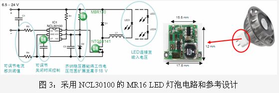 還有一款MR16 LED方案是用于降壓型應(yīng)用的NCL30100,它是能效大于95%的LED驅(qū)動器控制器,開關(guān)頻率高達(dá)700kHz,不需要輸出電容,Vcc工作范圍從6.35至18 V,可以驅(qū)動一個或多個大功率LED,主要用在MR16 LED照明、環(huán)境燈照明、太陽能LED、交通照明、室外照明和LED光條等應(yīng)用。其PCB非常小巧,可以裝入MR16燈的燈座內(nèi)。NCL30160的遲滯控制特性可在負(fù)載瞬期間提供快速的回應(yīng),無需小型信號控制環(huán)路補償元件。保護(hù)特性包括可利用電阻設(shè)定LED電流、LED短路保護(hù)、欠壓鎖定及熱關(guān)閉。