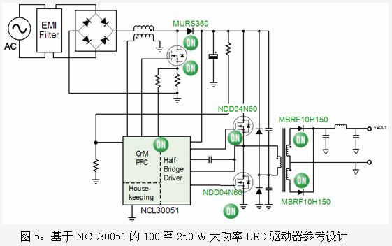 另一款專用LED電源集成電路是NCL30051,能夠為降壓直流-直流(DC-DC)轉(zhuǎn)換器/LED驅(qū)動器提供恒定電壓。該器件集成了一個臨界導(dǎo)電模式(CrM) PFC控制器及一個半橋諧振控制器,并內(nèi)置600V驅(qū)動器,針對離線電源應(yīng)用進(jìn)行了優(yōu)化,具備了所有實現(xiàn)高能效、小外形因數(shù)設(shè)計所需的特性。