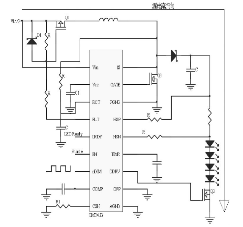 美國國家半導(dǎo)體研發(fā)的LM3423 芯片輸入電壓范圍在4.5V 到75V之間,適用于極寬的輸入電壓范圍;50KHZ 的快速PWM調(diào)光;內(nèi)部基準(zhǔn)電壓50mV- 1.25V;工作頻率最大可達到1MHZ;內(nèi)部驅(qū)動能力750mA,超低電流停機小于2uA.可以用來配置升壓、浮動降壓、浮動降壓/ 升壓和SEPIC 拓?fù)浣Y(jié)構(gòu)中低側(cè)外部MOSFET的控制器;使用峰值電流模式控制器和預(yù)測性關(guān)閉時間設(shè)計來調(diào)節(jié)LED 電流,峰值電流模式控制器與預(yù)測性關(guān)閉時間設(shè)計的組合簡化了回路補償設(shè)計,同時提供內(nèi)在的輸入電壓前饋補償;設(shè)有用于控制外部調(diào)光FET 和系統(tǒng)"零電流"關(guān)閉特點的集成驅(qū)動器;并且具有LED 狀態(tài)輸出標(biāo)記、故障標(biāo)記、可編程故障計時器和邏輯針腳,用于控制調(diào)光驅(qū)動器的極性。