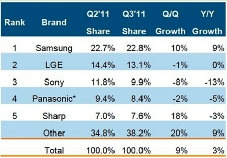 - 2011年第三季全球電視總出貨量較去年上升3.7%
