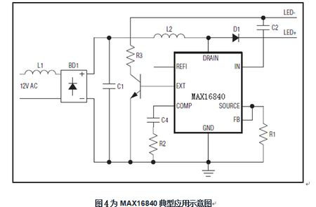 而MAX16840芯片有3個重要引腳功能:FB引腳電壓可檢測輸入電流,并調(diào)節(jié)其平均值;而輸入引腳(REFI)用于設(shè)置輸入電流值,引腳電壓低于特定門限時,輸入電流與該電壓成正比,電壓超過特定門限時,輸入電流將置于固定的預(yù)置水平。據(jù)此利用REFI的非線性特性,連接一個NTC電阻,即可得到熱折返保護(hù);IN引腳具有內(nèi)部過壓保護(hù),避免內(nèi)部開關(guān)MOSFET在LED串開路或LED串電壓過高時損壞;它帶有一個獨立的EXT引腳,確保低輸入電壓開啟時提供一個觸發(fā)啟動電流,以配合電子變壓器正常工作。EXT驅(qū)動外部npn晶體管,一旦IN跌落到5.5V UVLO門限以下,將EXT拉至地電平,外部npn晶體管關(guān)斷。其IC采用3mm x 3mm、10引腳、TDFN封裝,-40°C至+125°C工作溫度范圍。圖4為MAX16840典型應(yīng)用示意圖。它被廣泛應(yīng)用于MR16及其它12V交流或直流輸入LED照明之中。