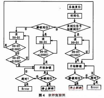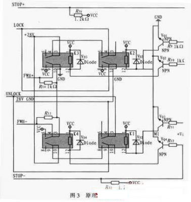 當(dāng)信號D0-D5為10000時,單片機(jī)通過P10口對方位鎖定機(jī)構(gòu)發(fā)出加鎖命令,控制命令經(jīng)SN54LS245驅(qū)動后作用于R9和VQ1,VQ1導(dǎo)通后,繼電器K2的4、5導(dǎo)通,輸出+28 VLOCK信號控制電機(jī)進(jìn)行加鎖。完全鎖定后,光電開關(guān)輸出(上)信號輸出高電平即圖3中STOP+,STOP+通過上拉電阻R16作用于R10和VQ2,VQ2導(dǎo)通后,繼電器K3的4、5和8、9導(dǎo)通,+28 V LOCK信號切斷,硬件上先停止加鎖控制,防止造成機(jī)構(gòu)硬件損傷。而K3的8、9導(dǎo)通后,F(xiàn)WH+輸出+5 V電平給單片機(jī),單片機(jī)接收信號后,終止加鎖命令,VQ1截止,K3恢復(fù)常態(tài)。解鎖過程和加鎖過程類似,在此不作贅述。