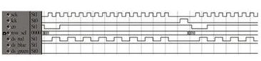 掃描驅(qū)動(dòng)輸出信號(hào)的仿真波形如圖5所示,其中en是灰度控制信號(hào),用來(lái)控制顯示時(shí)間,產(chǎn)生灰度效果;row_sel是行選信號(hào),顯示時(shí)用于確定點(diǎn)亮哪一行;sck是移位時(shí)鐘,lck是鎖存時(shí)鐘,ds_red、ds_blue、ds_green是上屏紅、藍(lán)、綠數(shù)據(jù)的輸入端。仿真時(shí)紅、藍(lán)、綠顯示數(shù)據(jù)分別設(shè)定為01交錯(cuò)、全1、全0??梢钥吹剑谝莆粫r(shí)鐘的作用下數(shù)據(jù)移位正確,移位完成后,lck變?yōu)楦唠娖剑瑢?shù)據(jù)鎖存輸出到LED屏上顯示。