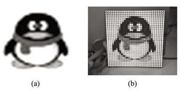 本設(shè)計(jì)采用32位嵌入式微處理器STM32F103ZET6和可編程邏輯器件EP1C6Q240C8設(shè)計(jì)了全彩色LED顯示屏控制系統(tǒng),并在實(shí)驗(yàn)室驗(yàn)證,實(shí)現(xiàn)了LED顯示屏的彩色顯示,圖6(a)為一幅實(shí)際圖像,圖6(b)是在顯示屏上的顯示效果。