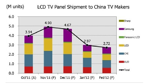 就總體液晶電視面板出貨而言, 預(yù)估向中國(guó)大陸本土廠商11月出貨量較上月成長(zhǎng)24%, 12月較11月下降5%; 而到2012年1月, 面板出貨數(shù)量將大幅度下滑至不足300萬片, 較12月下降達(dá)到36%。