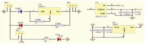 電源采用12V/1000mAh的鋰電池,直接為傾角傳感器供電,再經(jīng)兩路DC-DC轉(zhuǎn)換,分別轉(zhuǎn)換至9V和3.3V,9V電源為無線數(shù)傳模塊供電,3.3V為主控制器及接口電路供電,充電電路采用LM317芯片,恒流方式充電。電源電路見圖4所示。