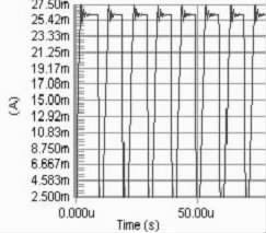 要保證PWM 周期小于電感的τ 時(shí)間, 因?yàn)槿鬚WM 的周期大于τ, 則極有可能出現(xiàn)在PWM 的占空比變化的情況下, 電路中電流都能達(dá)到電感的飽和直流電流, 影響了對LED 電流調(diào)節(jié)。當(dāng)C8051330 的時(shí)鐘頻率是25 MHz ,PWM 的周期的選擇對電流改變檔位的影響很大。若周期越大, 則PWM 占空比的檔位越多, 反之越少。擬用256 個檔位的占空比, 因此PWM 波的頻率應(yīng)選擇在100kHz 以下,即周期在10 μs 以上,直流電感為10Ω, 此時(shí)電感值應(yīng)選擇大于0.1 mH.圖2 分別是PWM 頻率為100kHz , 占空比為90%, 電感為0.1 mH、1 mH 和40 mH 時(shí)電路電流值的模擬結(jié)果。
