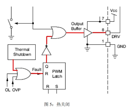 熱關(guān)閉(TSD):過熱保護(hù)功能有助于實現(xiàn)良好的電源設(shè)計。當(dāng)結(jié)點溫度超過140℃時,該功能激活,驅(qū)動器變?yōu)榈碗娖?;結(jié)點溫度降到典型值30℃時器件恢復(fù)工作。