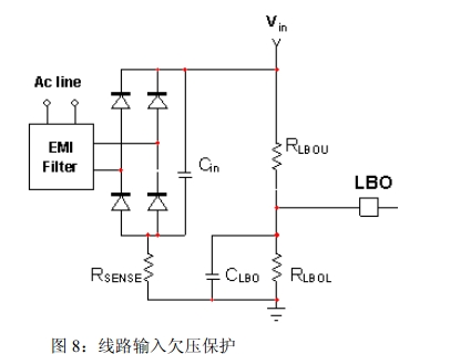 1.線路輸入欠壓(BO)保護(hù):線路輸入欠壓引腳接收部分平均輸入電流,因此,感測到低線路電壓時,50ms定時器就會激活。這段消隱時間用于幫助符合維持要求。如果線路電壓在50ms消隱延遲結(jié)束時仍處于低電平,輸入欠壓保護(hù)就被觸發(fā),PFC驅(qū)動器關(guān)閉,VCTRL引腳接地,可使器件在故障消失時使用軟啟動。