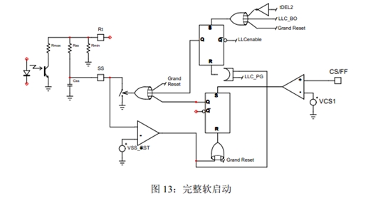 •在軟啟動或重啟時,專用引腳將SS電容放電至地,從而提供平順的輸出電壓上升;在LLC被CS/FF引腳(>1V)或BO功能關(guān)閉時,SS引腳給CSS放電,并提供純粹的軟啟動;