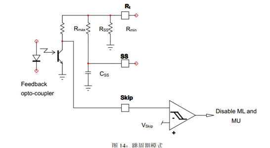 在下列情況時,VLBO可下拉至2V(VLBO(PD)):VLBO高于2V(高線路電壓時),以及VCTRL處于最大值的時間長于4ms(tPFCflag);Vbulk低于額定輸出的95%時。PFCPowerBoost功能在啟動時被禁止;最長下拉持續(xù)時間的典型值為5ms(tLBO(PDlimit));在后續(xù)最少70ms時間(tLBO(PDblank))內(nèi),開關(guān)保持在開路狀態(tài)。
