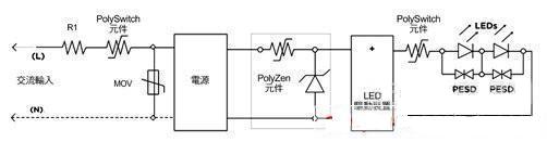 驅(qū)動輸出上的PolySwitch組件有助于防止因有害短路或其他負載異常而受損,為了充分發(fā)揮PolySwitch組件的作用,可以與金屬芯電路板或LED散熱片熱接,此外,與LED并置的PESD組件也可以對靜電放電加以保護。