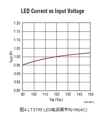 此外,LT3799在整個輸入電壓、輸出電壓和溫度范圍內(nèi)提供LED電流調(diào)節(jié)。從圖4可見,正如大多數(shù)美國照明應(yīng)用所要求,當輸入從90VAC變到150VAC時,LED電流保持在±5%的調(diào)節(jié)范圍內(nèi)。LT3799采用一個獨特的電流檢測電路取代了光耦合器,以向二次側(cè)提供良好調(diào)節(jié)的電流。此舉不僅降低了成本,還改善了可靠性。