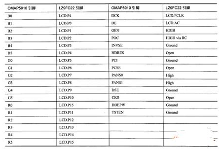 LZ9FC22和OMAP5910的LCD控制器連接,由于LZ9FC22是18位控制器(RGB信號(hào)各有6位),而OMAP5910的LCD控制器的輸出只有16位數(shù)據(jù),為此必須損失兩位數(shù)據(jù),將LZ9FC22的R0和BO接地,或者將R0和R5、BO和B5連接在一起。