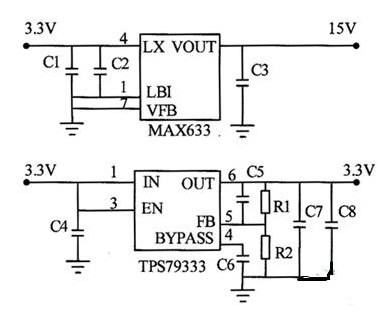 LQ035Q7D面板顯示需要15V的高壓,而LQ035Q7D的邏輯電平需要3.3V電源。圖3實(shí)現(xiàn)從3.3V轉(zhuǎn)換到15V和3.3V的電源原理。其中3.3V到3.3V使用TI公司的TPS79333,是為了保證輸出到LCD的3.3V穩(wěn)定可靠,如果TPS79333的輸入3.3V足夠穩(wěn)定,滿足LQ035Q7D的要求,也可以直接將該電源連接到LCD。