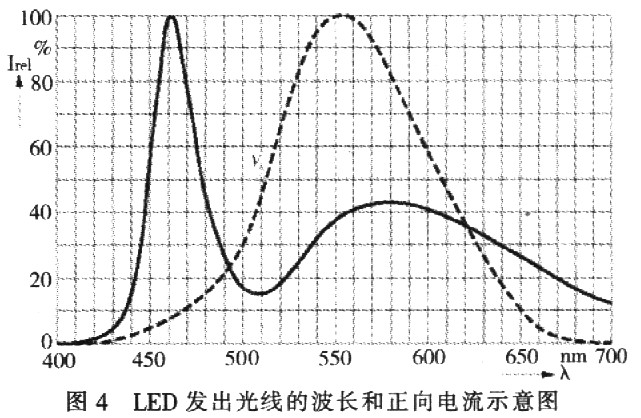 白光LED設(shè)計(jì)中采用了一個(gè)小竅門。在發(fā)射藍(lán)光的InGaN基料上覆蓋轉(zhuǎn)換材料,這種材料在受到藍(lán)光激勵(lì)時(shí)會(huì)發(fā)出黃光。于是得到了藍(lán)光和黃光的混合物,在肉眼看來就是白色的,圖4為L(zhǎng)ED發(fā)出光線的波長(zhǎng)和正向電流示意圖。由圖4可以看出:白光LED的發(fā)射波長(zhǎng)(實(shí)線)包括藍(lán)光和黃光區(qū)域的峰值,但是在肉眼看來就是白色。肉眼的相對(duì)光敏感性(虛線)如圖4所示。