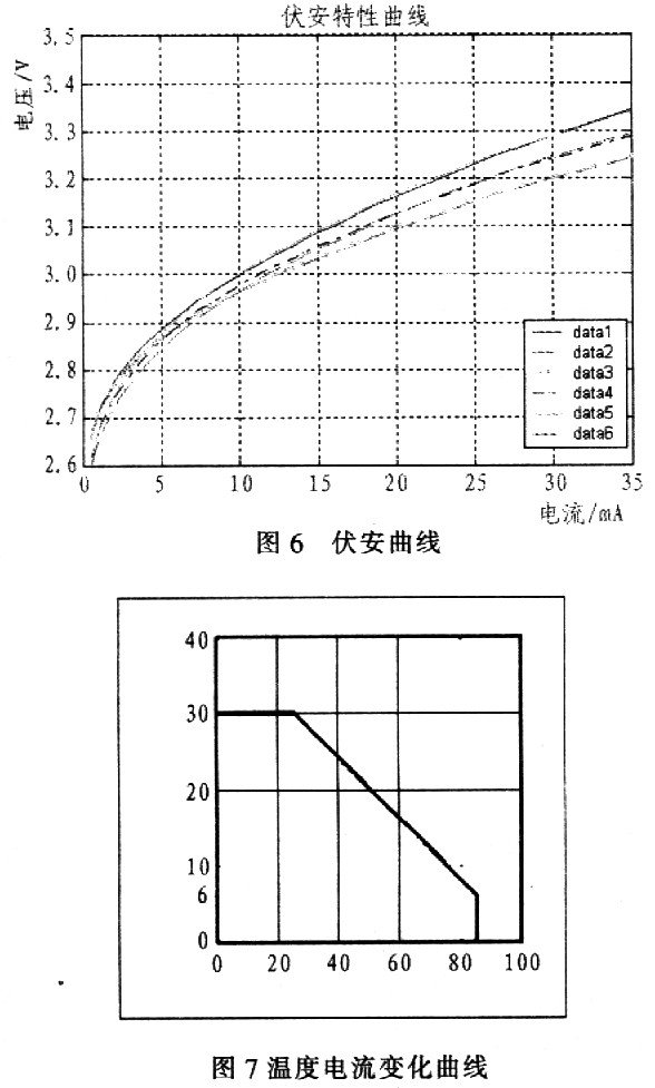圖6和圖7分別為L(zhǎng)ED的伏安曲線和溫度電流曲線。由LED發(fā)光原理可以知道,白光LED的亮度變化主要是由其通電電流決定的。