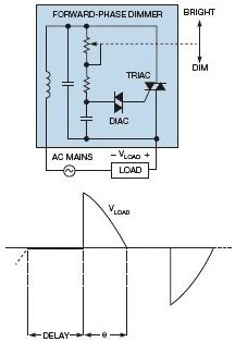 一個(gè)標(biāo)準(zhǔn)的正相調(diào)光器包含一個(gè)TRIAC、一個(gè)DIAC(二極管交流)和一個(gè)RC(電阻/電容)電路(圖1)。電位計(jì)調(diào)節(jié)電阻值,得到的RC時(shí)間常數(shù)用于控制TRIAC導(dǎo)通前的延遲量,或觸發(fā)角。當(dāng)TRIAC導(dǎo)通時(shí),時(shí)間部分就是導(dǎo)通角θ。得到的電壓波形就是一個(gè)切相的正弦曲線。