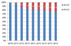 過去一年,雖然國際市場需求下降,但是中國彩電市場仍保持穩(wěn)定成長。而2012年中國3D頻道的開播,不僅將3D電視熱潮推到更高,也成為拉動彩電銷售增長的一個新亮點。根據(jù)NPD DisplaySearch報告指出,2012年第四季中國3D電視滲透率可達25%。