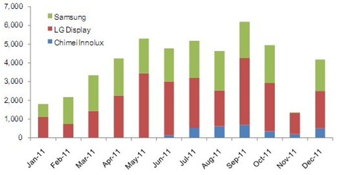 2011年9.7" iPad平板電腦面板出貨達(dá)到了4千8百萬片。雖然面板廠商之前的出貨預(yù)期更高,但受到了第四季度庫存調(diào)整的影響而最終無法達(dá)到2011年全年5千萬片以上的目標(biāo)。2011年的9.7寸面板出貨以XGA(1024x768)規(guī)格為主,亮度要求為400nits以上;且采用了IPS或FFS規(guī)格的廣視角技術(shù),而主要的面板供貨商為韓國的三星、LG Display與臺(tái)灣的奇美。根據(jù)NPD DisplaySearch每月TFT LCD面板出貨報(bào)告(Monthly TFT LCD Shipment Database),三家9.7寸面板供貨商在2011年的出貨各有千秋,如下圖所示。