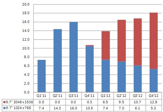 NPD DisplaySearch 指出,展望2012年,9.7寸iPad 面板出貨預(yù)計(jì)將可達(dá)6千5百萬片以上,主要驅(qū)動(dòng)力來自于新的iPad機(jī)種的推出、既有iPad面板的成本再降低、面板分辨率的再提升以及新面板技術(shù)(例如薄化玻璃、透明金屬氧化物晶體管TFT LCD等等)的采用。