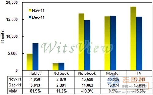 監(jiān)視器面板出貨量為1,607萬片,月增0.9%;筆記型電腦面板出貨量為1,486萬片,月減10.9%。平板電腦方面,WitsView指出,蘋果(Apple)新一代 iPad 3 面板,持續(xù)受到生產(chǎn)良率問題,造成目前供貨量依然受到限制,但華南地區(qū)對于山寨平板電腦需求,依舊強勁,整體平板電腦面板出貨較11月增加61.9%,出貨量來到801萬片。小筆電用面板出貨量則來到230萬片,較上月增加11.2%。