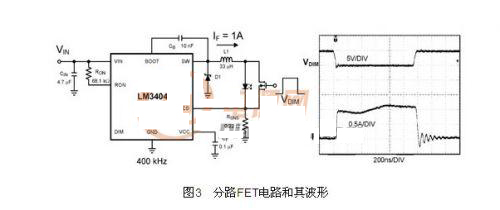 從一個沒有輸出電容器的快速降壓穩(wěn)壓器著手,出現(xiàn)在輸出電流開啟和關(guān)閉的延遲,是來自集成電路本身的傳導(dǎo)延遲和輸出電感器的物理特性。若要達(dá)到真正高速的PWM調(diào)光,兩個延遲都須被略過(By Pass)。要實現(xiàn)這個目標(biāo),最佳方法就是采用一個與LED并聯(lián)的電源開關(guān)(圖3)。當(dāng)LED關(guān)閉時,驅(qū)動電流便會分流通過開關(guān),作用就如同一個典型的N型金屬氧化半導(dǎo)體場效晶體管(N-MOSFET),這時集成電路會繼續(xù)運行,而電感器電流也會持續(xù)流動。該方法的最大缺點在于LED關(guān)閉時,即使期間的輸出電壓下降到與電流感測電壓相同,仍會浪費功率。