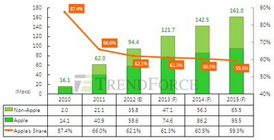 在蘋果的iPad 3即上市的的之際,2012年平板計(jì)算機(jī)市場(chǎng)的爭(zhēng)奪戰(zhàn)才算正式開打,根據(jù)產(chǎn)業(yè)研究機(jī)集邦科技(TrendForce)統(tǒng)合旗下WitsView(面板)、DRAMeXchange(NAND Flash)的研究數(shù)據(jù),預(yù)估在2012年時(shí)全球平板計(jì)算機(jī)銷量將可望達(dá)到9,400萬臺(tái),比起2011年的6,200萬臺(tái),年成長(zhǎng)達(dá)53.1%,在平板計(jì)算機(jī)的銷售量上,蘋果仍將維持前二年的強(qiáng)勢(shì)地位,其iPad將占市場(chǎng)六成以上,達(dá)5,900萬臺(tái)。