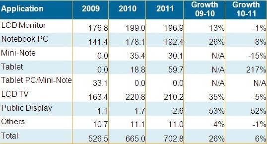 筆記本電腦與公共顯示器依舊維持較佳表現(xiàn),分別有8%與52%的出貨成長。平板電腦尤其是蘋果iPad的強(qiáng)勁出貨態(tài)勢,使平板電腦面板在2011年出貨接近6千萬片,較2010年大幅成長21%。