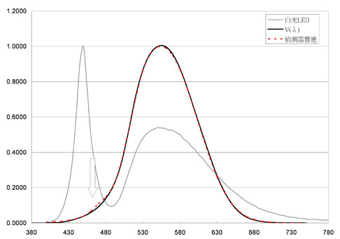 圖5 白光LED多以藍(lán)光激發(fā)黃色熒光粉,在藍(lán)光波段(圖中箭號表示)處,亮度計(jì)探頭的視效函數(shù)(虛線表示)響應(yīng)與CIE V(λ)匹配不佳時(shí),差異的比例就會加大。