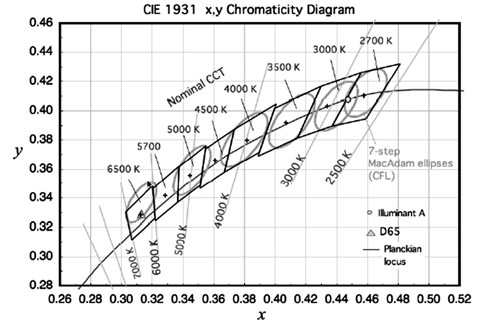 此規(guī)范包含美國國家標(biāo)準(zhǔn)中針對固態(tài)照明產(chǎn)品的光色特性規(guī)格定義,適用于室內(nèi)使用的燈具,不包括戶外燈具。其中,重點(diǎn)有兩部分,其一是定義相對色溫(CCT)的分級,其次是針對同一相對色溫標(biāo)稱等級其允許的色溫變異范圍作定義。
