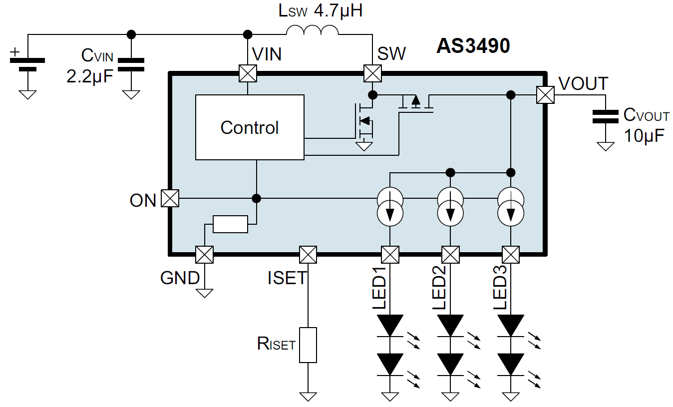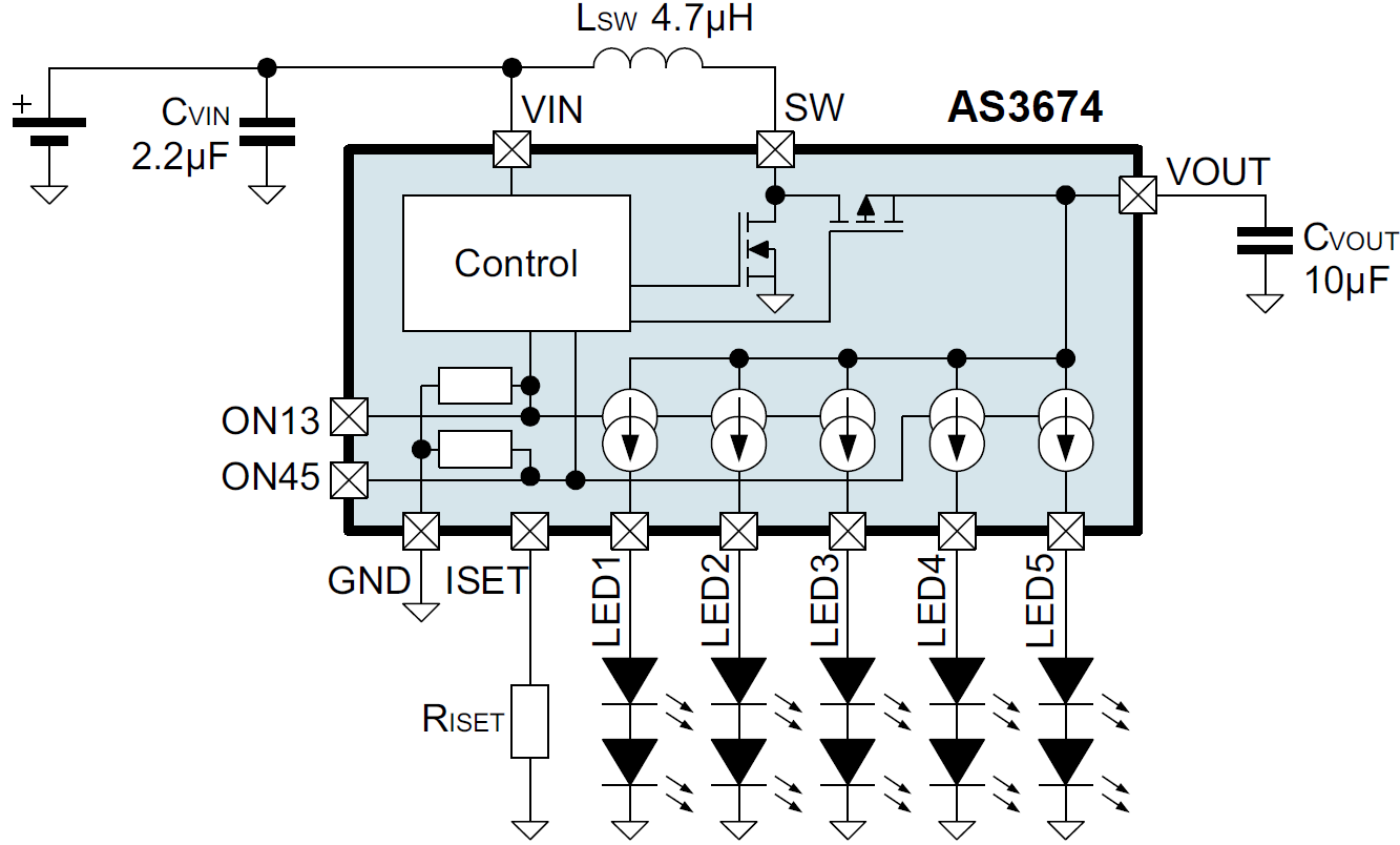 軟啟動的特點使AS3674更容易集成到對噪音敏感的無線射頻系統(tǒng)中。AS3674由兩組輸入電路控制,也可用介于100-800赫茲的PWM電路控制,實現(xiàn)1:2000的調(diào)光比。單通道兩個LED的配置結合2 MHz的轉(zhuǎn)換器操作頻率,實現(xiàn)使用諸如4.7µH電感的微小外部組件并取得優(yōu)于競爭對手最高達6%的高效率。
