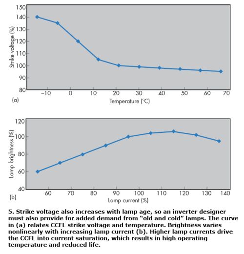 LCD工作時(shí)的環(huán)境溫度是背光驅(qū)動(dòng)器設(shè)計(jì)人員需要考慮的一個(gè)關(guān)鍵因素。CCFL啟動(dòng)或起始電壓與溫度成反比。圖5a顯示了CCFL起始電壓與溫度之間的典型關(guān)系,圖5b則展示了與電燈電流增大相關(guān)的CCFL亮度變化曲線。