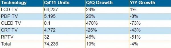2011年第四季全球電視出貨量較去年同期下降4%,為7千420萬臺(tái)。液晶電視出貨量?jī)H上升1%,為2004年以來最低;等離子電視下降了8%,CRT電視下降了43%。日本和西歐市場(chǎng)降幅最大,北美也僅維持少量增長(zhǎng),第四季度三個(gè)地區(qū)的電視總出貨量較去年同期下降了21%。新興市場(chǎng)電視出貨持續(xù)成長(zhǎng),增幅為12%,其中液晶電視出貨成長(zhǎng)了20%。