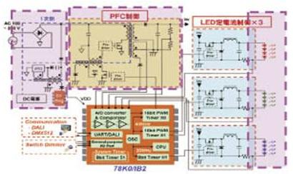 基于78K0/IB2 LED路燈方案如圖8所示??蓪?shí)現(xiàn)AC220V,具有 PFC;驅(qū)動總功率60W;調(diào)光通信接口可采用RS485/PLC接口。