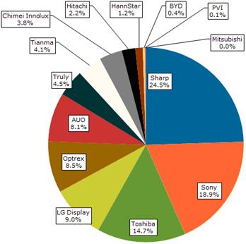 夏普為領先廠商,擁有24.5%的市占率;索尼居次,為18.9%;東芝則有14.7%的市占率。