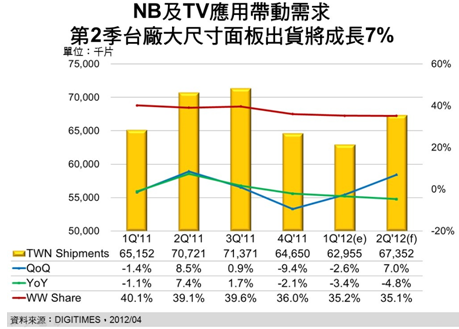 2012年第2季臺(tái)廠大尺寸(9寸以上)TFT LCD面板總出貨量將為6,735.2萬(wàn)片,較前一季增加7%,但較2011年同期則減少4.8%,DIGITIMES Research資深分析師兼副主任黃銘章分析,主要原因?yàn)椴示Ъ叭A映相繼地淡出大尺寸面板市場(chǎng),2011年華映的各類NB面板出貨達(dá)到664萬(wàn)片,但2012年將降至不足100萬(wàn)片。因此,預(yù)期臺(tái)廠佔(zhàn)全球出貨量比重在第2季仍將微幅下跌0.1個(gè)百分點(diǎn)至35.1%。