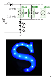 NSI45的另一個(gè)典型應(yīng)用是用作顯示屏和廣告牌文字電路的恒流穩(wěn)流器線性LED驅(qū)動(dòng)器。其特點(diǎn)包括低啟動(dòng)電壓,無論正向電壓(Vf)如何變化都可以實(shí)現(xiàn)精密穩(wěn)流,具有負(fù)溫度系數(shù)特性,可以保護(hù)LED。