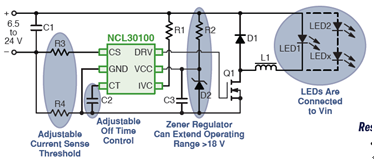 該驅(qū)動(dòng)器控制器開關(guān)頻率高達(dá)700kHz,不需要輸出電容,Vcc工作范圍從6.35至18 V,可驅(qū)動(dòng)一個(gè)或多個(gè)大功率LED,主要用在MR16 LED照明、環(huán)境燈照明、太陽能LED、交通照明、室外照明和LED光條等應(yīng)用。采用NCL30100的PCB非常小巧,可以裝入MR16燈的燈座內(nèi)。NCL30160的遲滯控制特性可在負(fù)載瞬期間提供快速的響應(yīng),無需小型信號(hào)控制環(huán)路補(bǔ)償元件。保護(hù)特性包括可利用電阻設(shè)定LED電流、LED短路保護(hù)、欠壓鎖定及熱關(guān)閉。