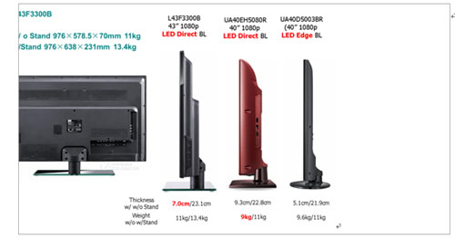 事實(shí)上,BMS模式對(duì)于品牌廠商而言并非完全出于成本考慮,而更側(cè)重于產(chǎn)品的差異化,以及品牌廠商將對(duì)渠道和消費(fèi)者的理解體現(xiàn)在具體產(chǎn)品上,這對(duì)于提升品牌廠商終端產(chǎn)品競(jìng)爭(zhēng)力而言至關(guān)重要。因此,我們可以發(fā)現(xiàn),從2010年起,幾乎所有一線品牌廠商新增的系統(tǒng)組裝產(chǎn)品均為BMS模式。以下為T(mén)CL在BMS模式下生產(chǎn)的直下式的LED電視在基本外觀尺寸上與Samsung最新推出的直下式產(chǎn)品對(duì)比。從相關(guān)的指標(biāo)來(lái)看,中國(guó)本土品牌在BMS一體化制造的能力已經(jīng)取得了非常大的進(jìn)步,甚至領(lǐng)先一步。
