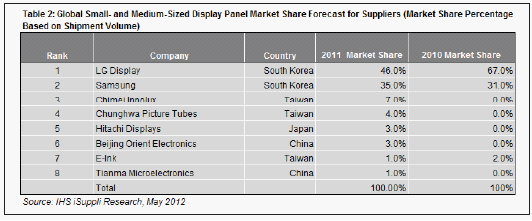 據(jù)IHS iSuppli公司的中小顯示器市場(chǎng)追蹤報(bào)告,LG顯示器和三星顯示器去年是火爆的平板產(chǎn)品市場(chǎng)的最大顯示器面板供應(yīng)商,合計(jì)占有超過80%的出貨量份額。