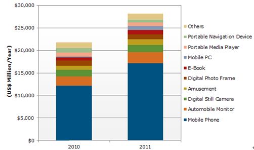- 應(yīng)用于手機(jī)的主動矩陣式顯示器的出貨量增加到2011年的15億臺