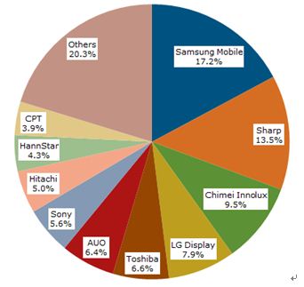 一如預(yù)期,三星移動顯示器(SMD)再次維持其領(lǐng)先的地位,在2011年市占率達(dá)到17.2%,主要來自于AMOLED在智能手機(jī)市場應(yīng)用的提高。緊隨其后的是夏普和奇美, 2011年市占率分別為13.5%和9.5%。