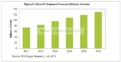 2012年中國市場的PC出貨量預(yù)計達(dá)到8360萬臺,比去年的7390萬臺增長13%。至少從2008年以來,中國臺式電腦與筆記本的國內(nèi)出貨量一直保持兩位數(shù)的強(qiáng)勁增長,預(yù)計這種健康勢頭還將再保持兩年,直到2015年溫和放緩至9%。