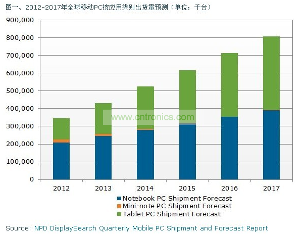 據(jù)DisplaySearch—平板電腦,如蘋(píng)果的ipad,預(yù)計(jì)將成為未來(lái)幾年移動(dòng)PC市場(chǎng)的主要增長(zhǎng)動(dòng)力。根據(jù)NPD DisplaySearch季度移動(dòng)PC出貨與預(yù)測(cè)報(bào)告Quarterly Mobile PC Shipment and Forecast Report,2016年平板電腦出貨量將超過(guò)筆記本電腦,移動(dòng)PC(指包括筆記本電腦、上網(wǎng)本、平板電腦等)總出貨量將從2012年的3億4千700萬(wàn)臺(tái)增長(zhǎng)到2017年8億900萬(wàn)臺(tái)。