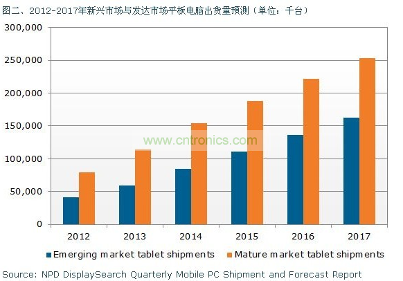 筆記本電腦出貨量預(yù)計(jì)從2012年的2億800萬(wàn)臺(tái)增長(zhǎng)到2017年的3億9千300萬(wàn)臺(tái),而平板電腦出貨量預(yù)計(jì)將同期從1億2千100萬(wàn)臺(tái)增長(zhǎng)到4億1千600萬(wàn)臺(tái),年復(fù)合增長(zhǎng)率將達(dá)28%。平板電腦成長(zhǎng)的主要?jiǎng)恿?lái)自于在發(fā)達(dá)市場(chǎng)的應(yīng)用增長(zhǎng)(包括北美、日本和西歐),2012年該市場(chǎng)平板電腦的出貨占比為66%,并且在整個(gè)預(yù)測(cè)期內(nèi)占比也將保持在60%左右。平板電腦在發(fā)達(dá)市場(chǎng)的出貨量預(yù)計(jì)將從2012的8千萬(wàn)臺(tái)增長(zhǎng)到2017年的2億5千400萬(wàn)臺(tái)。
